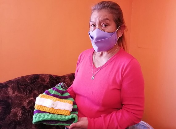 Ella comenta que debido al confinamiento social cayó en depresión y como una forma de distracción comenzó a tejer para su familia algunas prendas como gorros, calcetas, cintillos, sweaters.