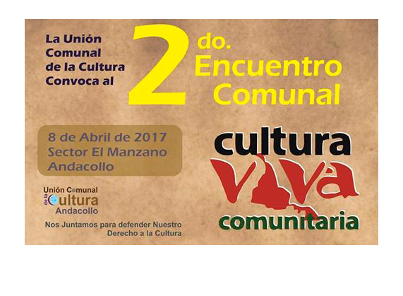 La Unión Comunal de la Cultura está convocando a todos los gestores de Andacollo para el 2° Encuentro Comunal de Cultura Viva que se realizará este sábado 8 de abril en la localidad de El Manzano. La salida será a las 08:30 hrs, desde Andacollo para comenzar a sesionar a las 09:00 hrs. El regreso está contemplado a las 19:00 hrs.